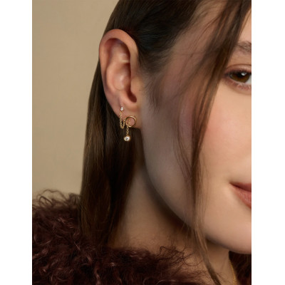 L’orecchino doppio buco in oro giallo 18 carati unisce cerchio e sfera charm con diamante attraverso una sottile catena d’oro, creando un equilibrio perfetto tra gioco e sofisticatezza. Ogni dettaglio racconta movimento, luce e libertà. Per chi ama un look luminoso, audace e raffinato.
