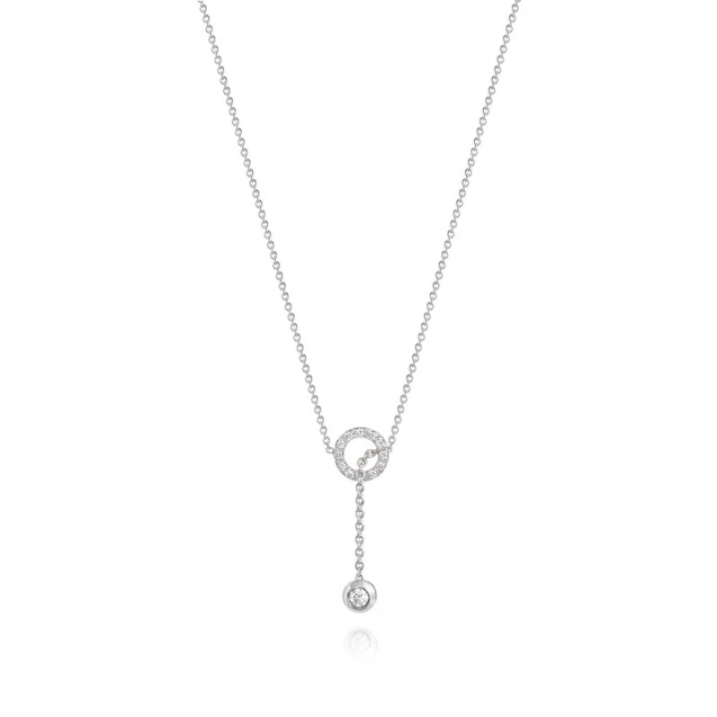 Eleganza fluida e raffinata: la collana in oro bianco 18 carati con cerchio di diamanti e sfera charm con diamante incarna equilibrio e luce. La catena passante crea un design dinamico, perfetto per chi ama la modernità senza tempo.